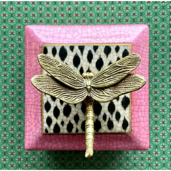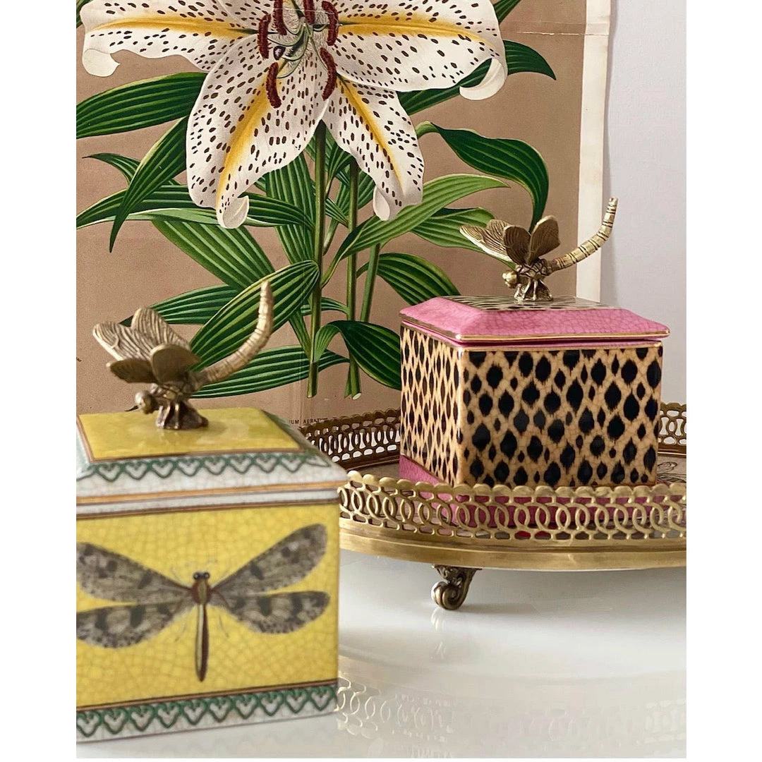 Unique ceramic lidded trinket box with dragon fly sitting atop the lid and cheetah design.