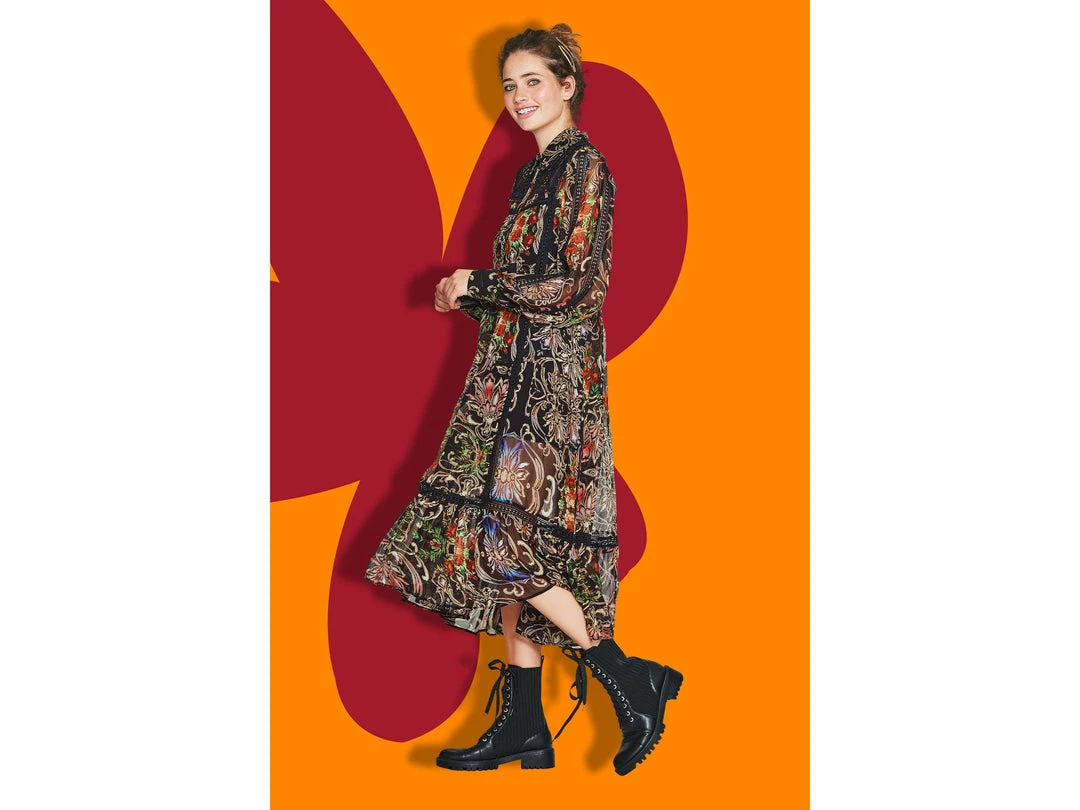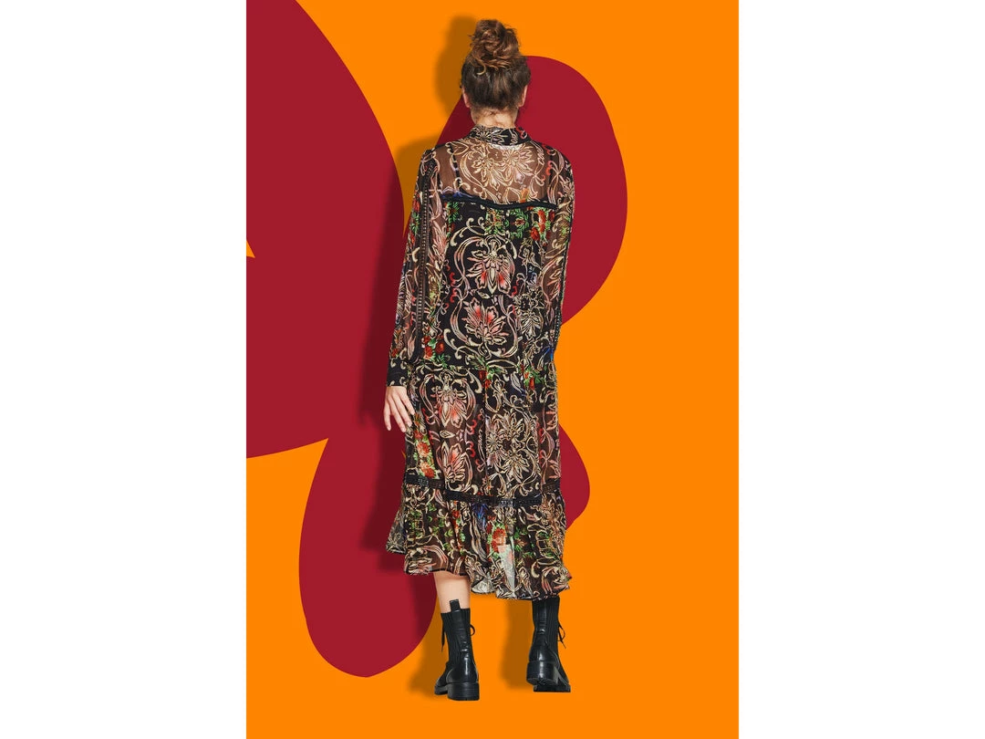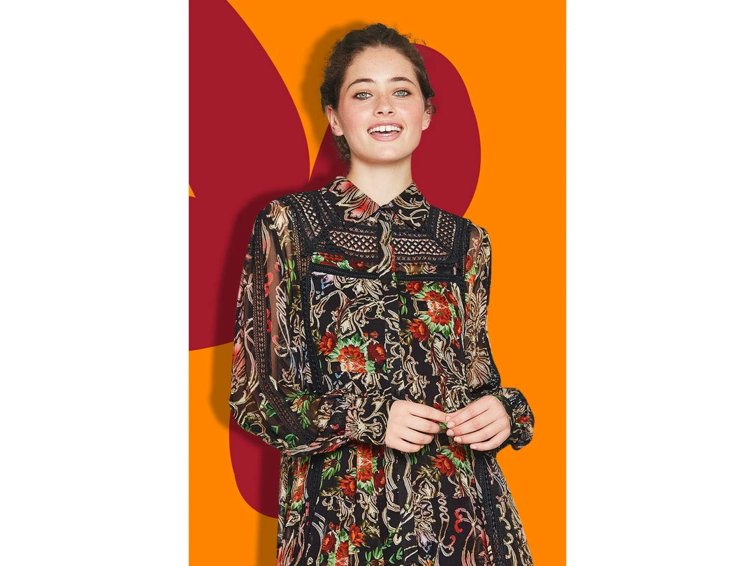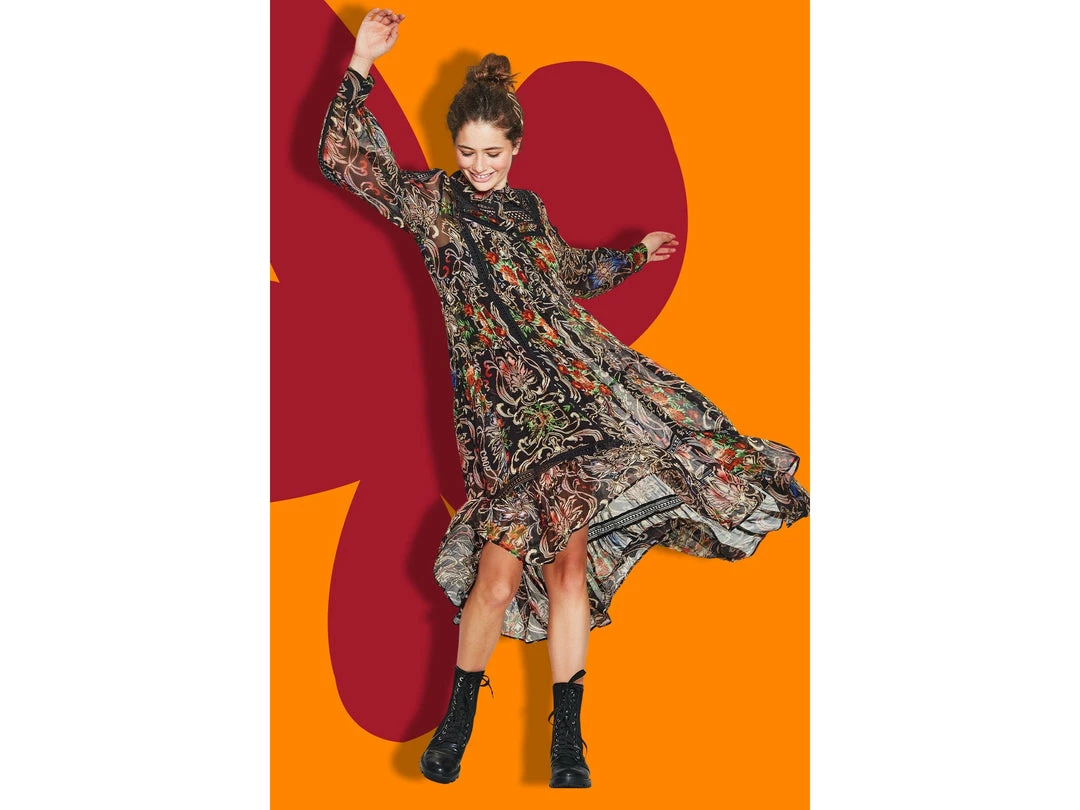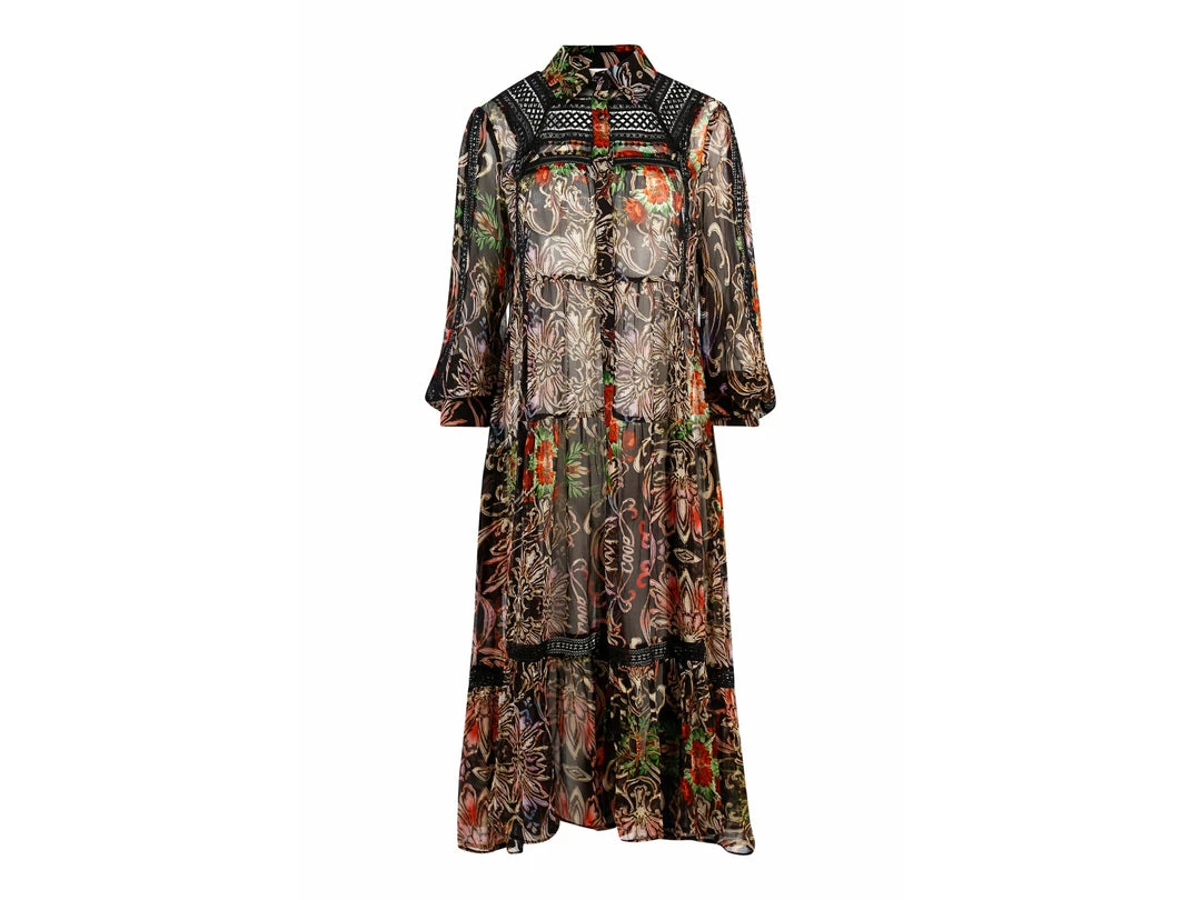 Designed in the ‘Moonflower’ viscose yoryu, an intricately patterned print that stands out against a black background. The ‘State of Lace’ tiered maxi dress features stunning lace inserts, a classic collar and button through front. This is an effortlessly elegant everyday to evening dress.