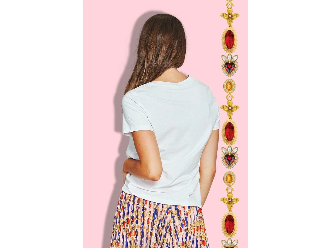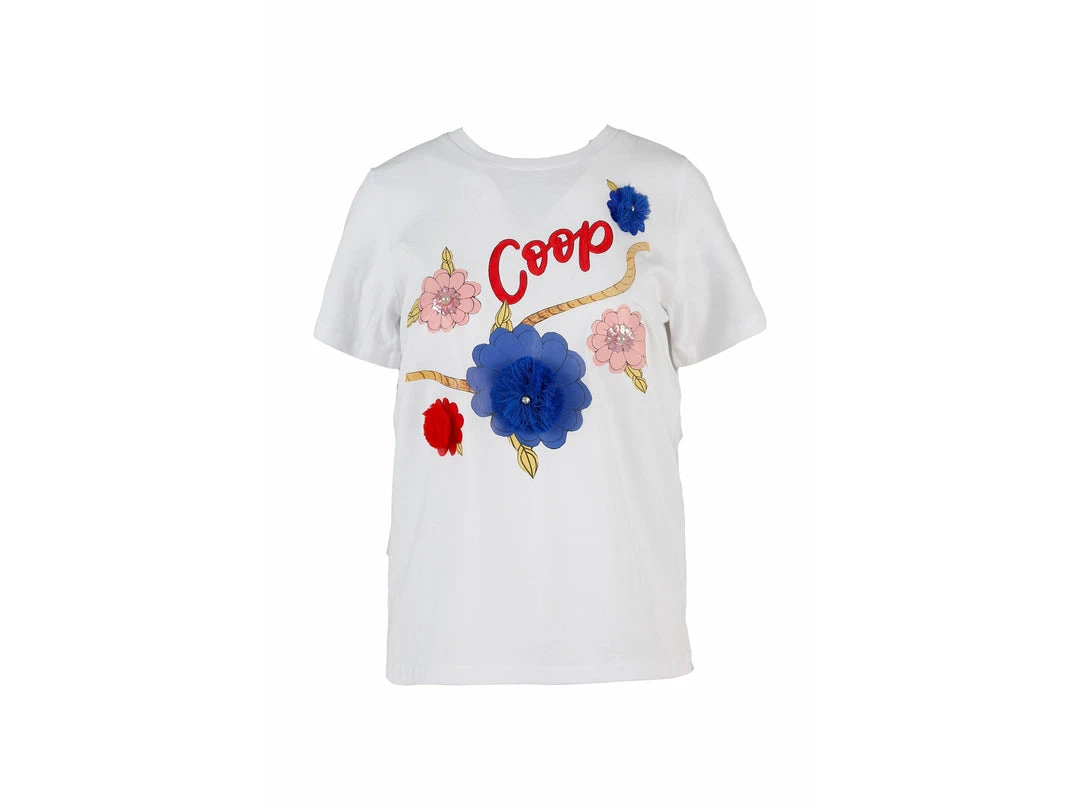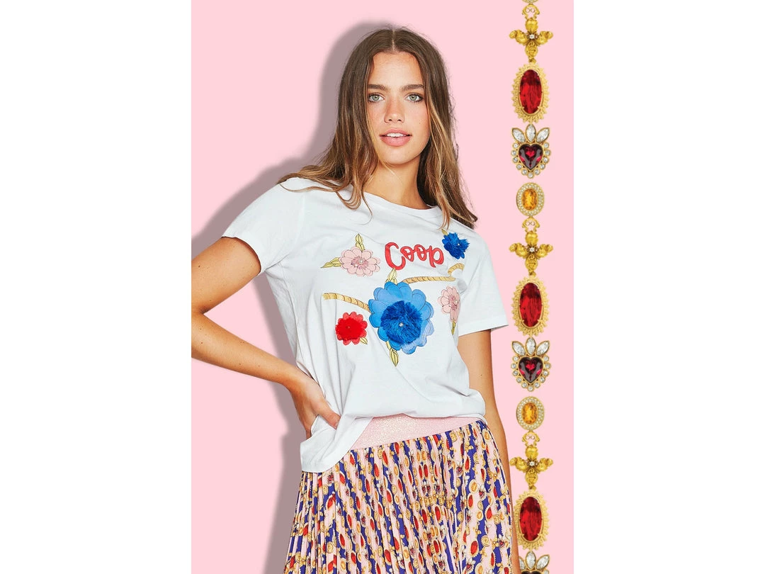 This seasons Coop tee features gorgeous beaded and tassel embellishments and a bold floral print design.