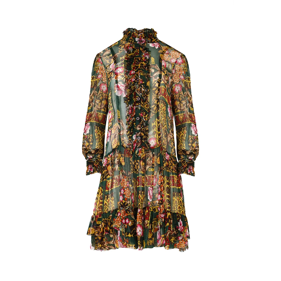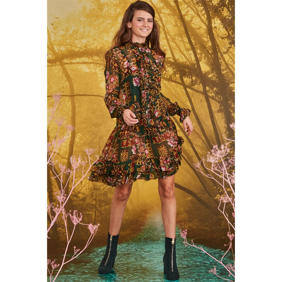 Designed in the ‘Sheer-wood’ viscose yoryu. A Victorian inspired silhouette featuring a statement frilled neckline, buttoning through the front to the waist which falls into a gathered drop-waist skirt with a gathered tier hemline.
