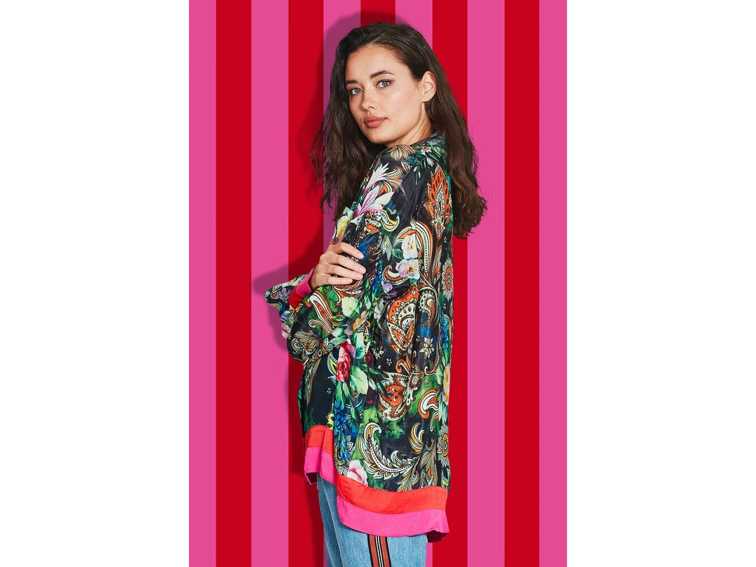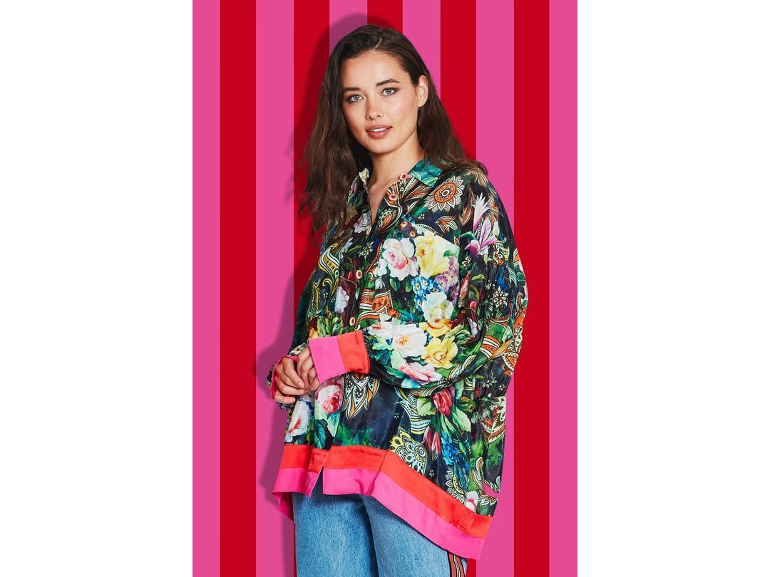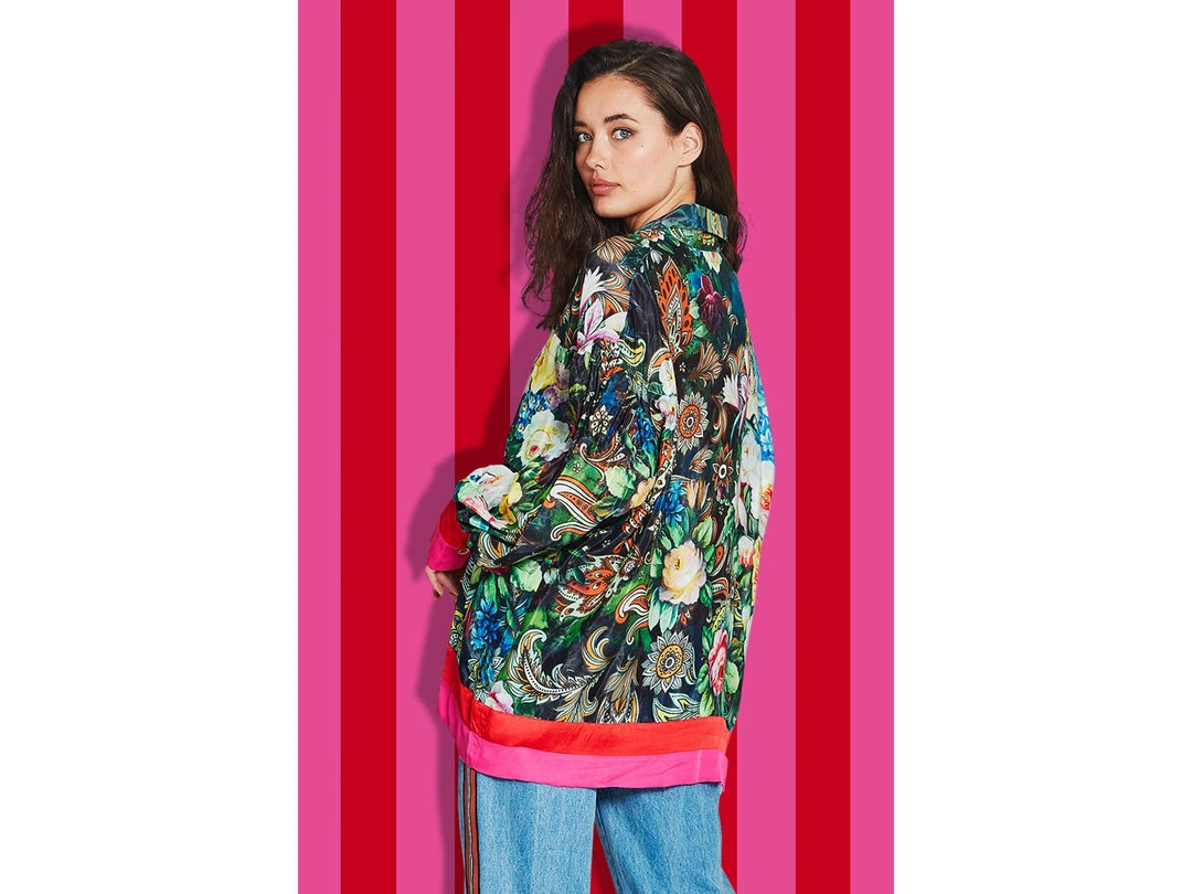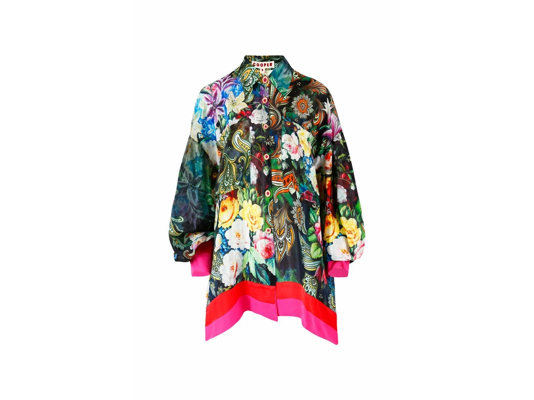Designed in a ‘Floral Trip’ printed viscose CDC. This shirt blooms floral grandeur. Featuring exaggerated long blouson sleeves, button through front and contrasting stripes at the hem and cuffs. Add a touch of luxury in your everyday with a piece that will take you from day to night.