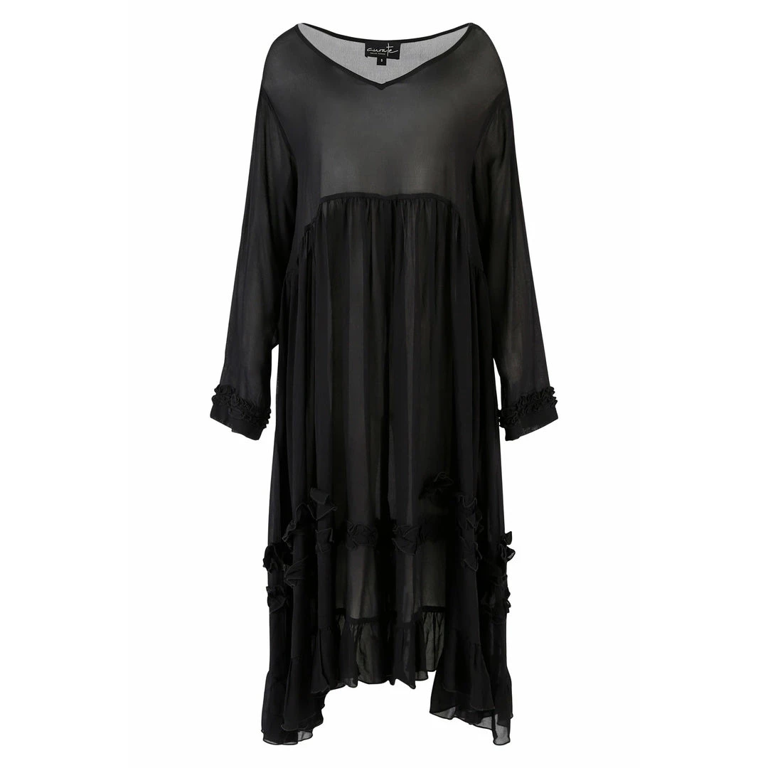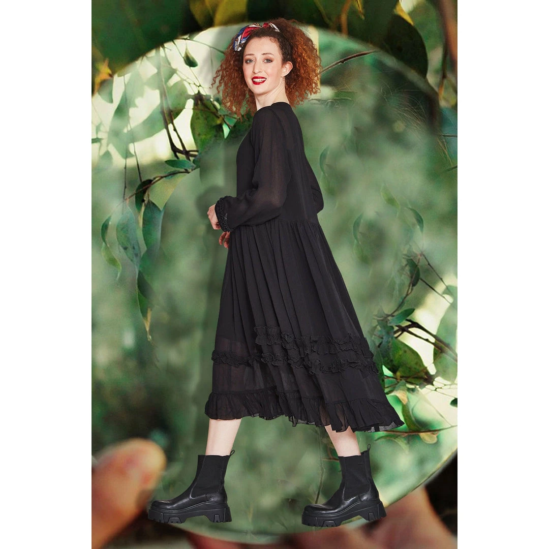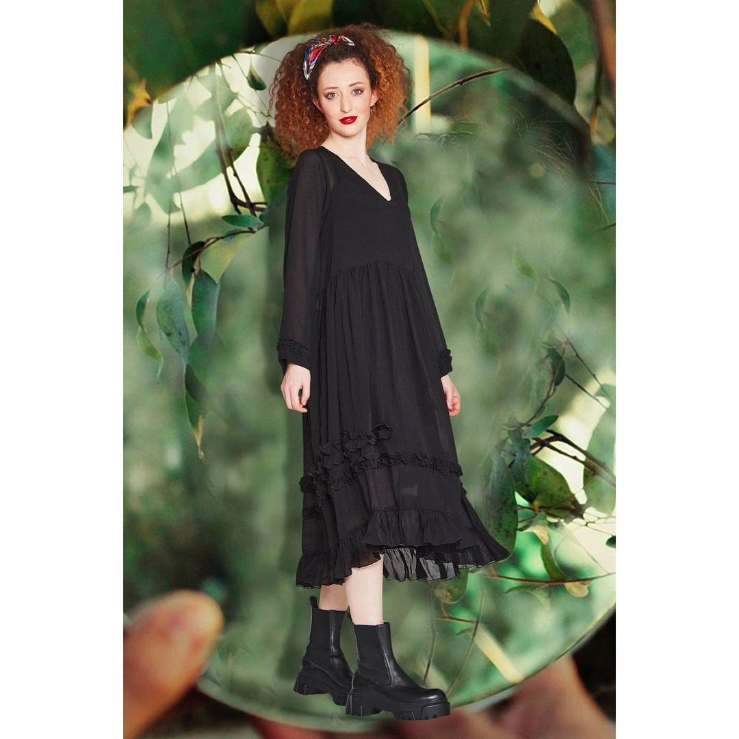 Designed in a ‘Crepe Expectations’ viscose GGT. A flattering silhouette to make you feel endlessly feminine. Featuring a V-neck, frilled cuffs, gathering under bodice floating down to a frill hem and complementing frill detail on lower half of skirt. Choose from three vivid shades and make this your go-to piece for any occasion.