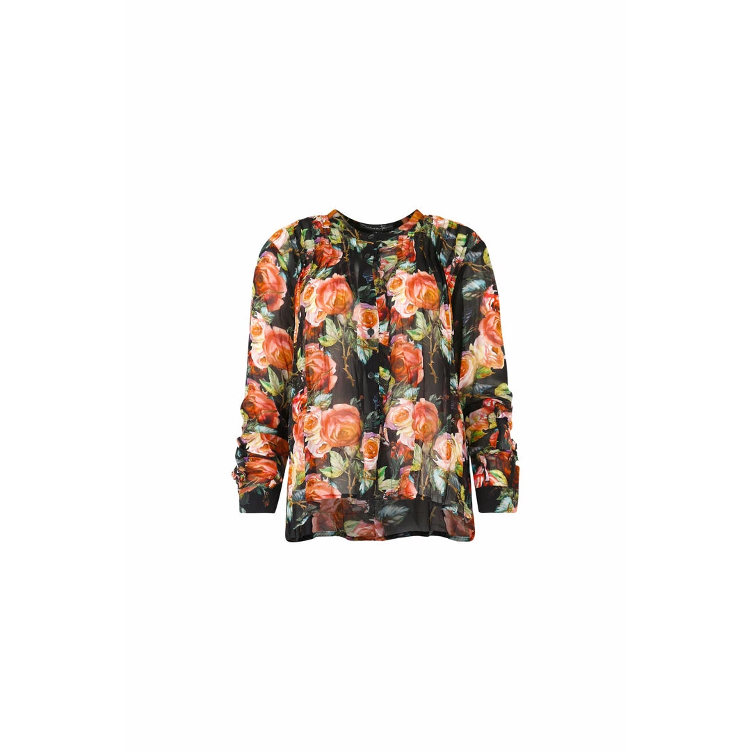 Designed in the ‘Walk Around The Roses’ viscose chiffon. Striking bright coloured vintage florals against a black back ground make a feminine, statement sheer blouse. Featuring pin tuck neckline. Mix n match pattern by pairing with our ‘Here Kitty’ jeans.