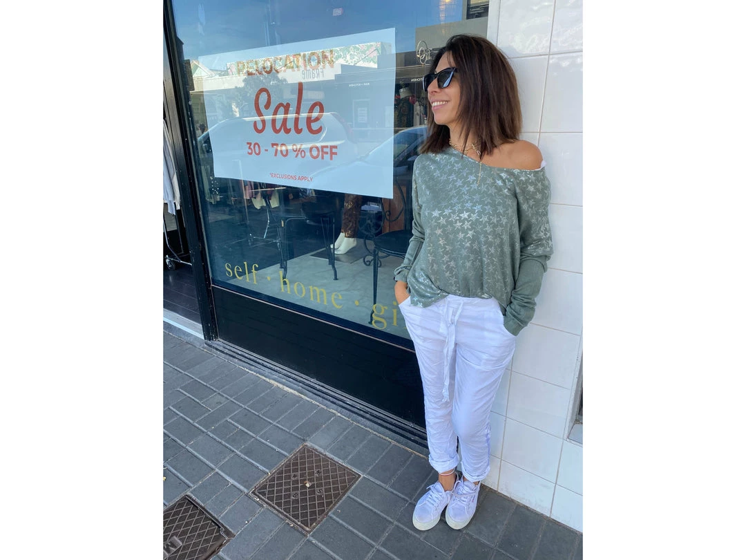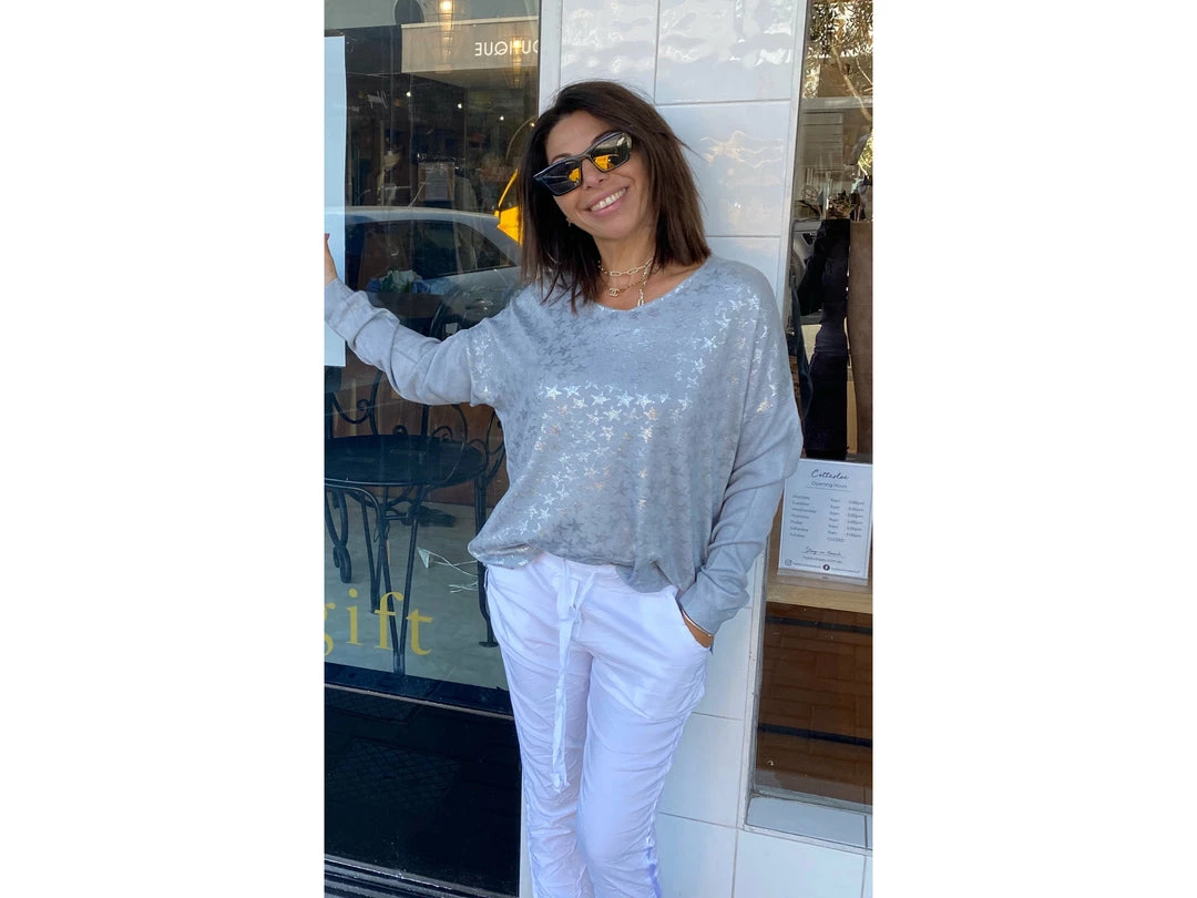 Stylish and starry with just the right amount of flare! The perfect piece for keeping you cosy as the weather gets cooler. Featuring large silver stars, this gorgeous knit is perfect for mixing and matching with all your wardrobes favourites. Paired with Waxed pant with or wear with your go to jeans & trainers.