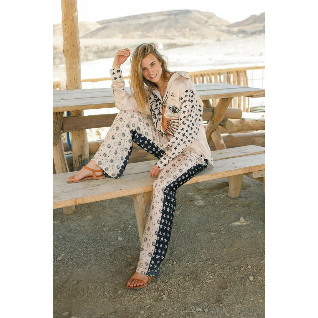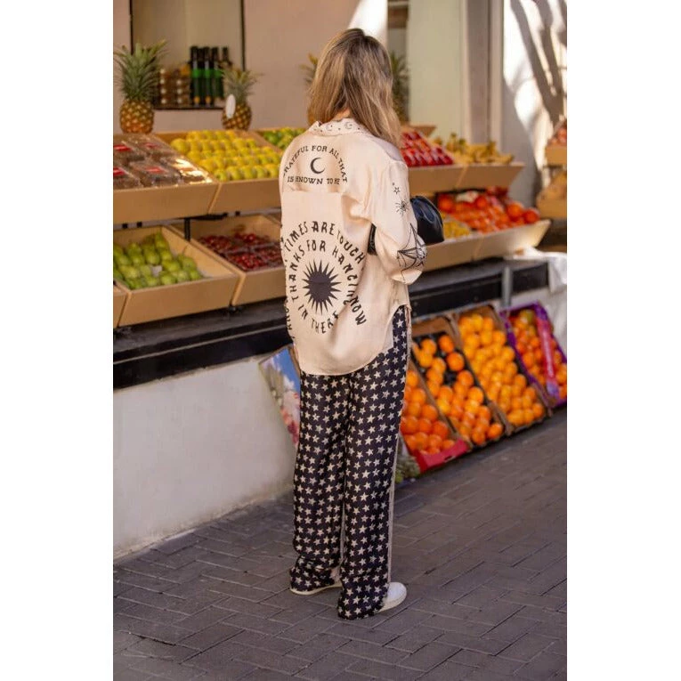Moon & Sun on the Front & Stars on the back. Easy to pair with a plain blouse or your favourite knit.