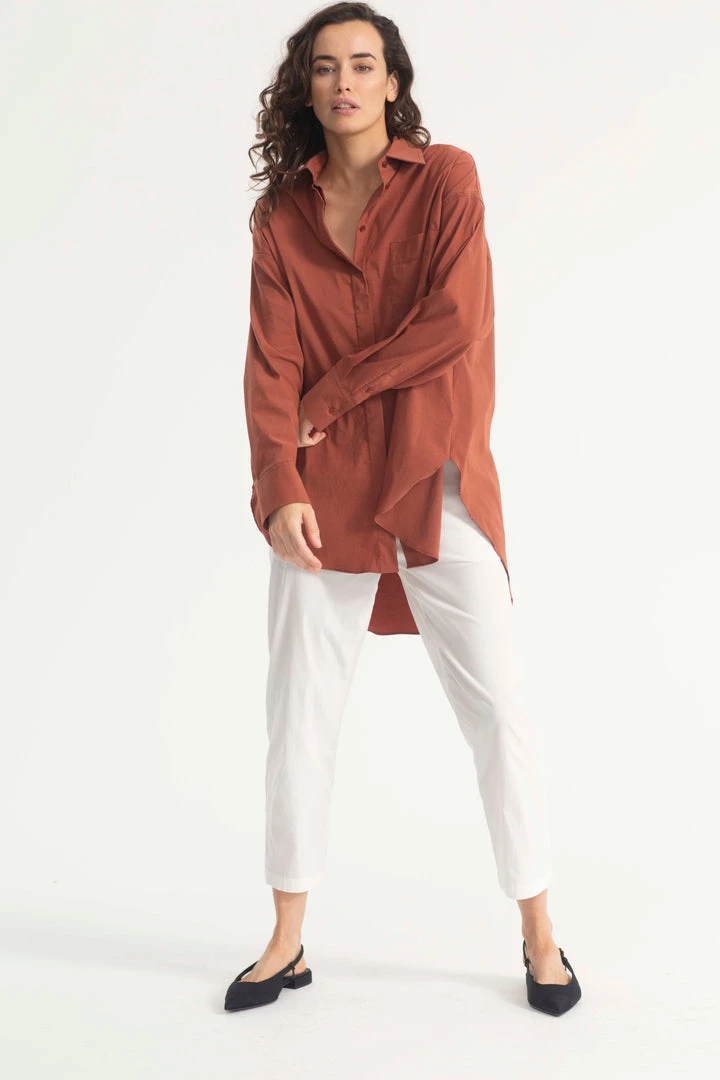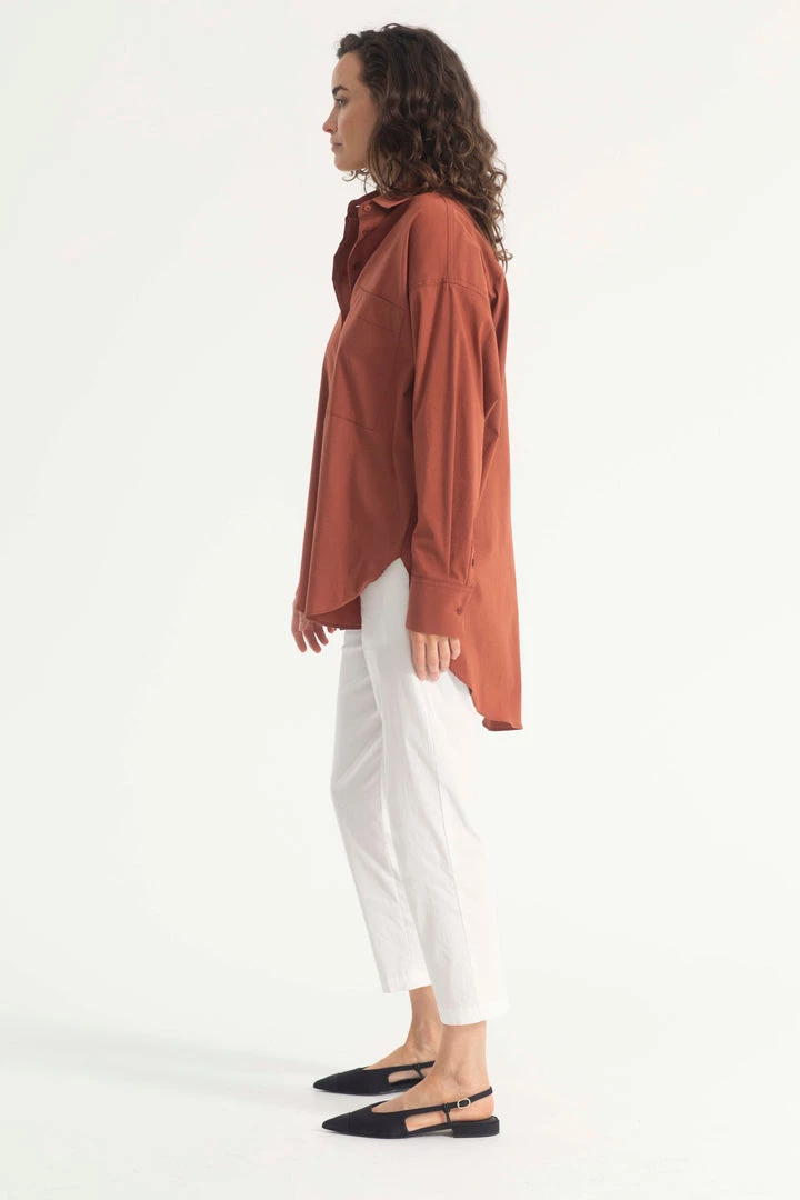 Cut from Mela Purdie’s exclusive French stretch cotton blend Microprene. The Nomad Pant is cut for tapered fit through the leg with an elasticised waist and side entry pockets. Pair with a loose fitting top for a relaxed, off-duty look.