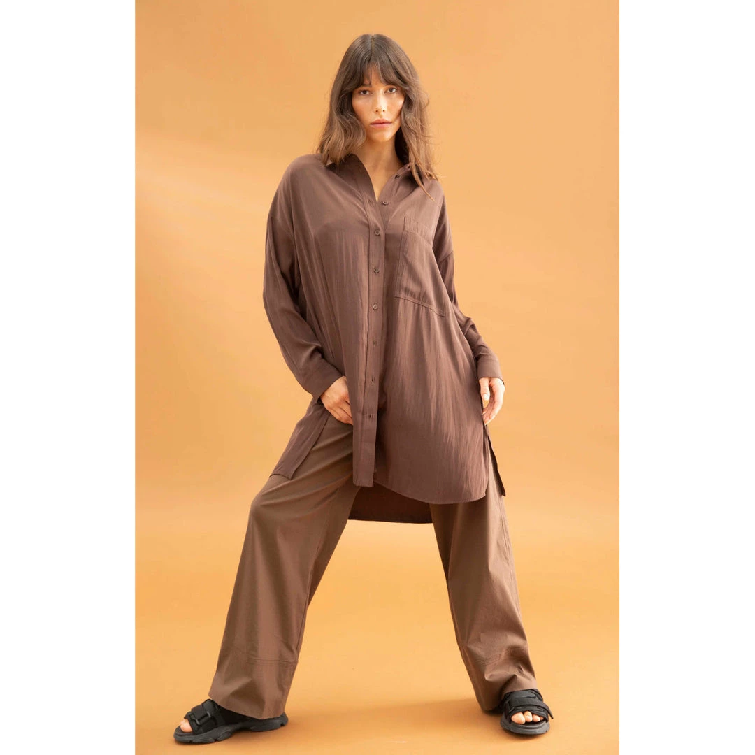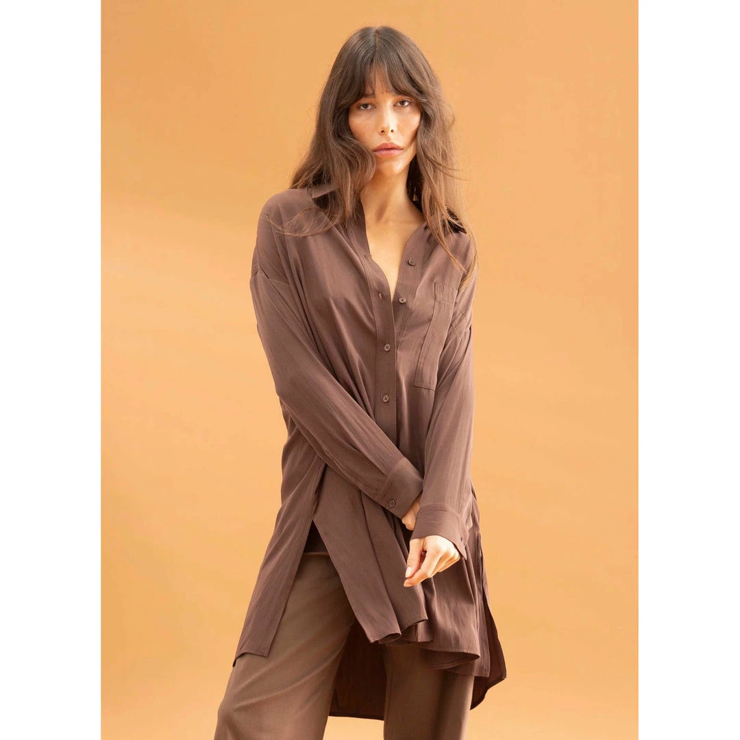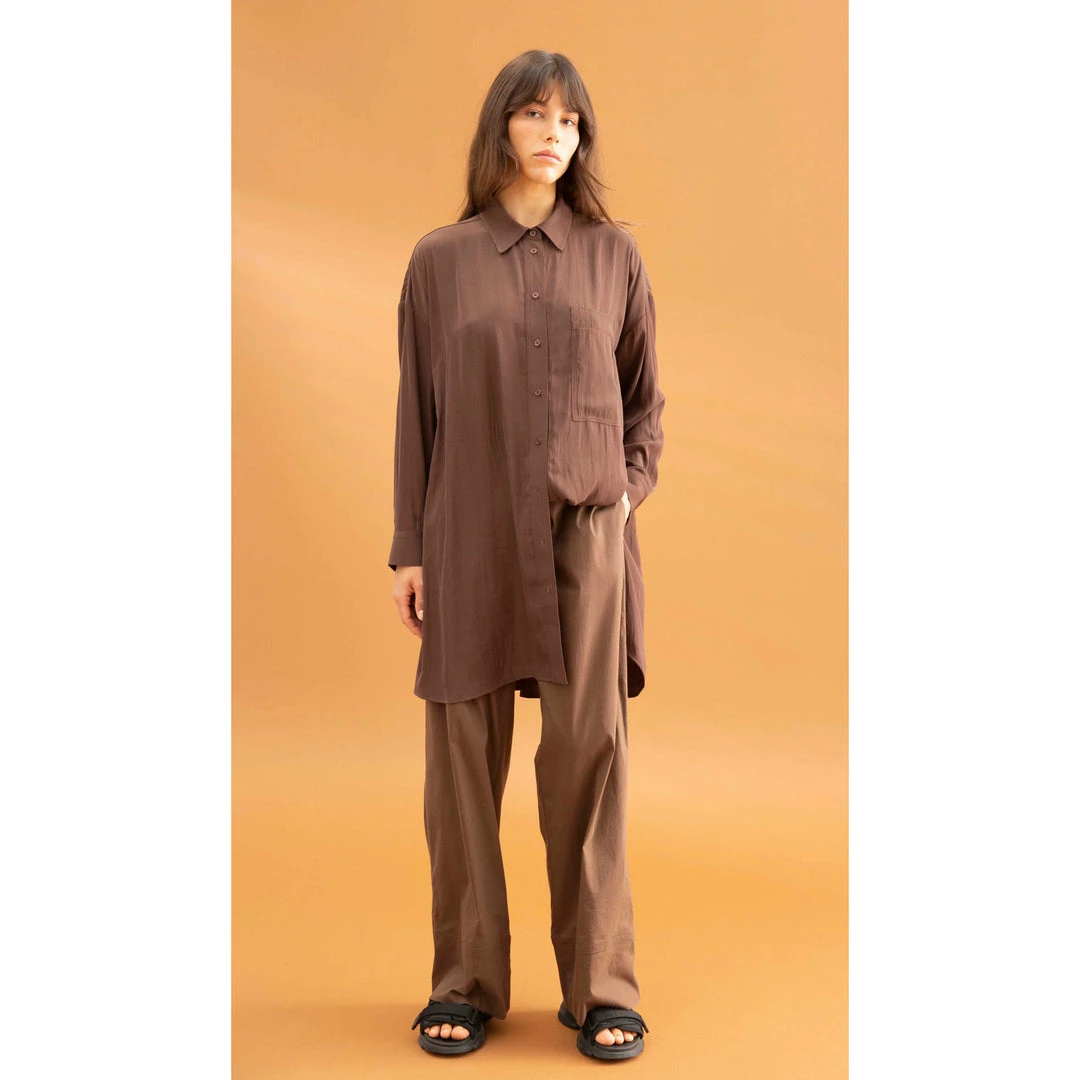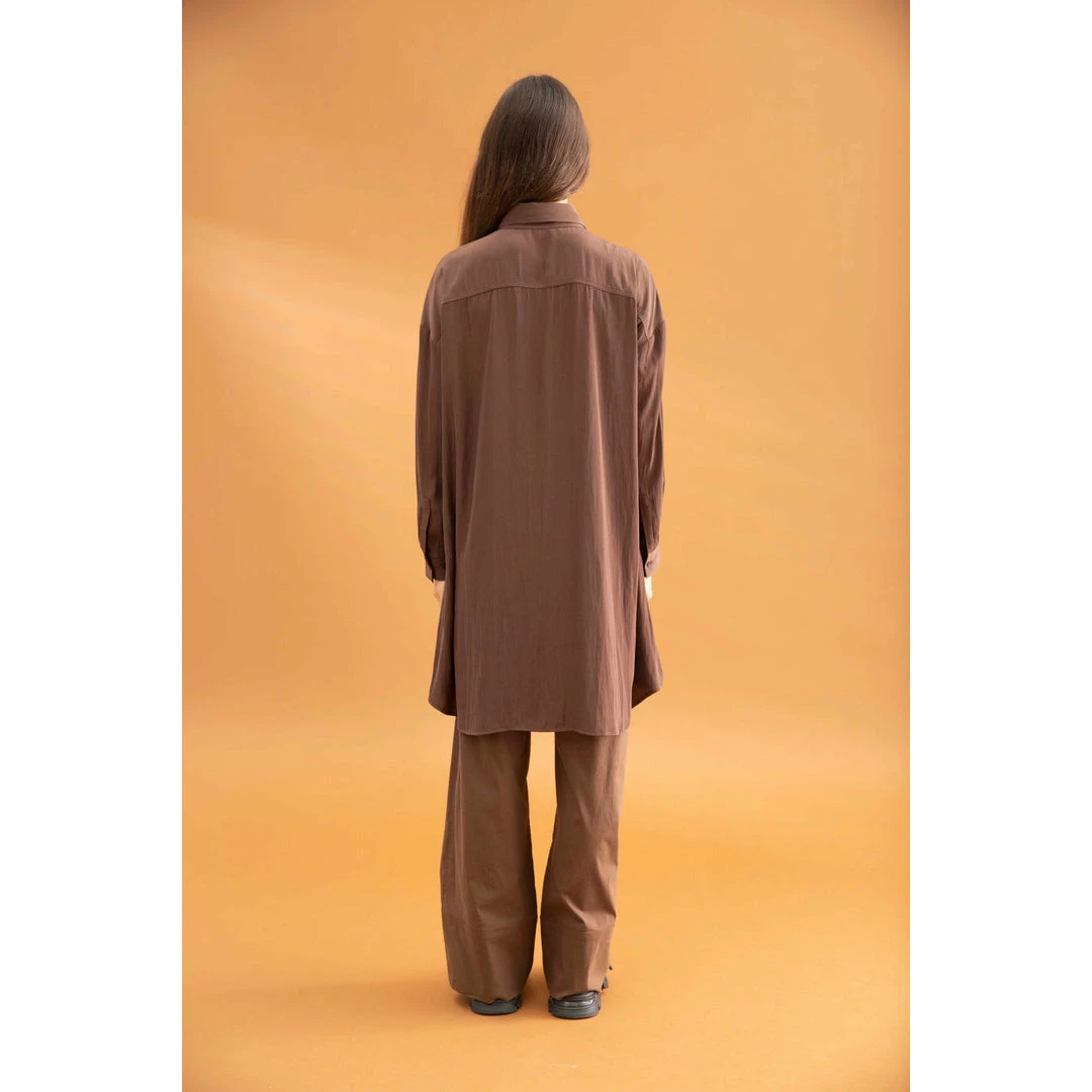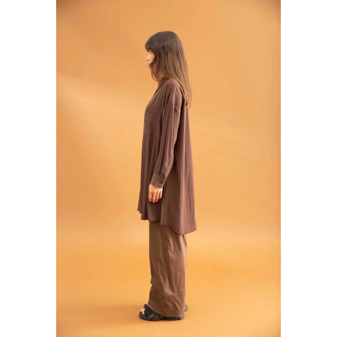 Crafted from Mela Purdie’s fluid Mache, the Cabana Over-Shirt is generously proportioned through the body with a classic shirt collar, full cuffed hem sleeve and single patch pocket detailing on the front. The cool and relaxed fit makes this the perfect overshirt to wear over slim pants or open for fluidity.