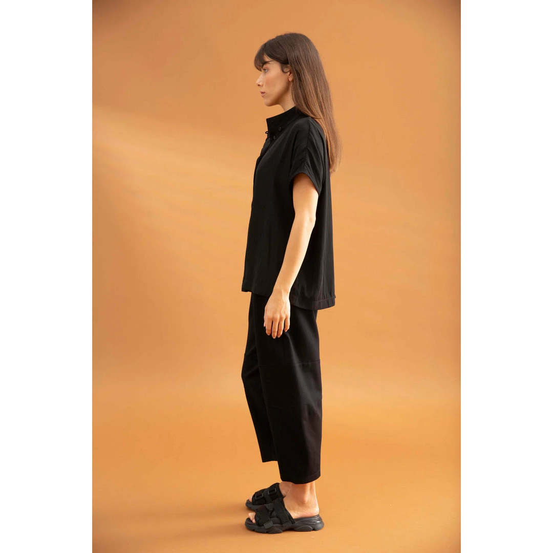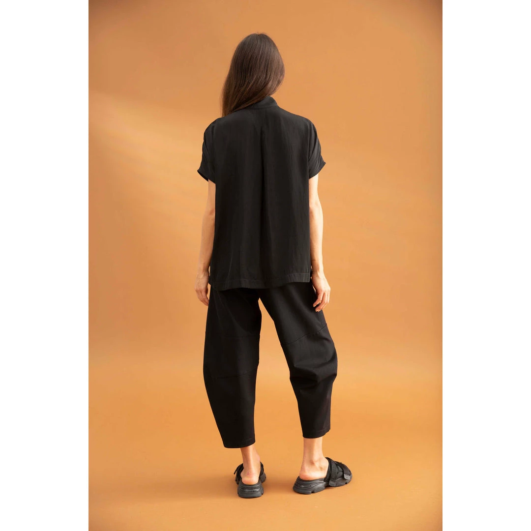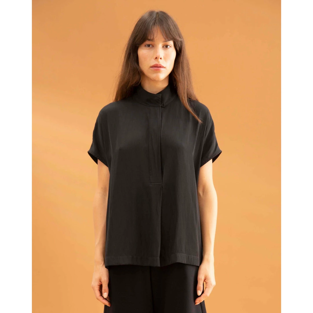 Crafted from Mela Purdie’s fluid Mache, this sophisticated blouse features capped sleeves, a slight curved hemline and a simple pleat at the neck to encourage movement. The Cylinder Shell is finished with a stand collar, fastened by a single button, creating a soft fold at the front.