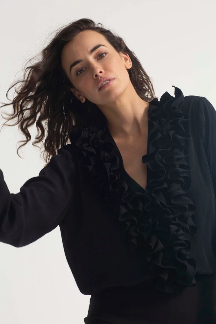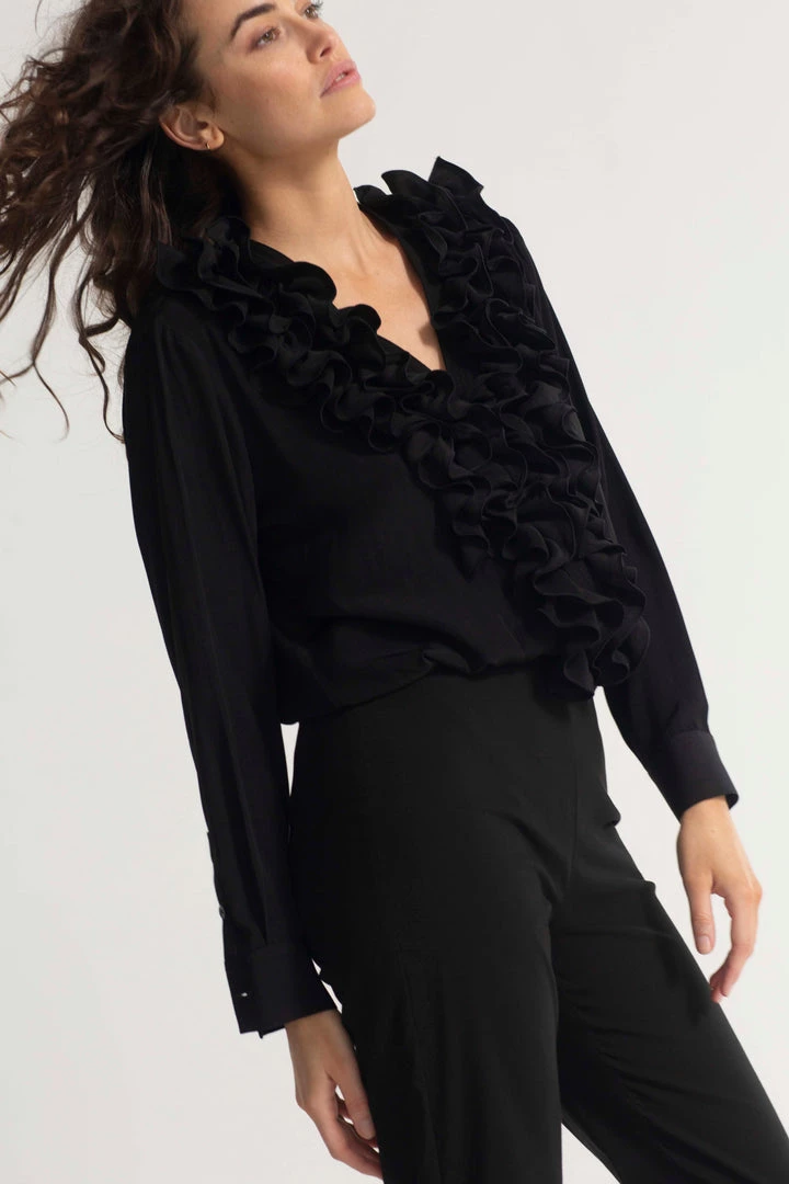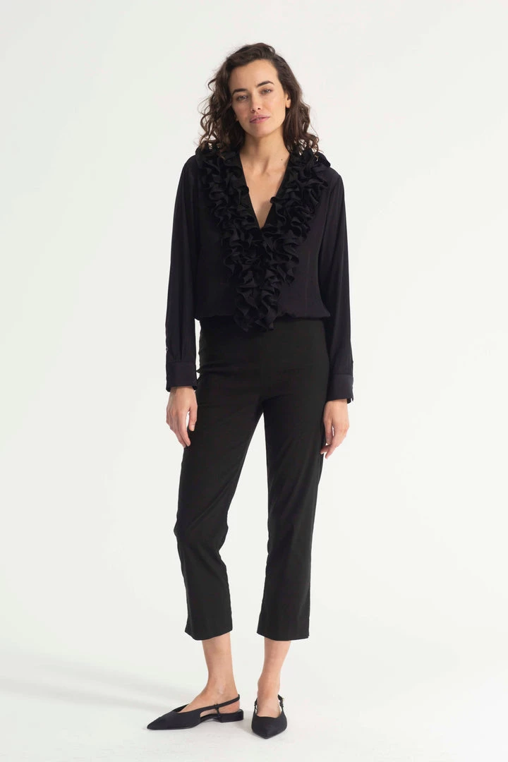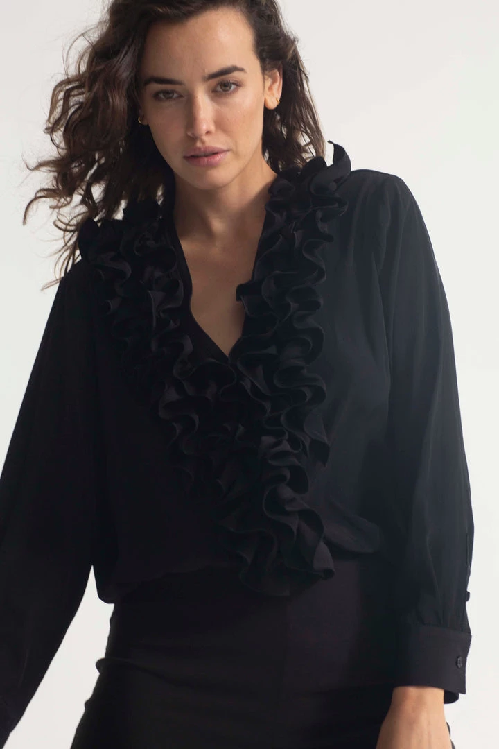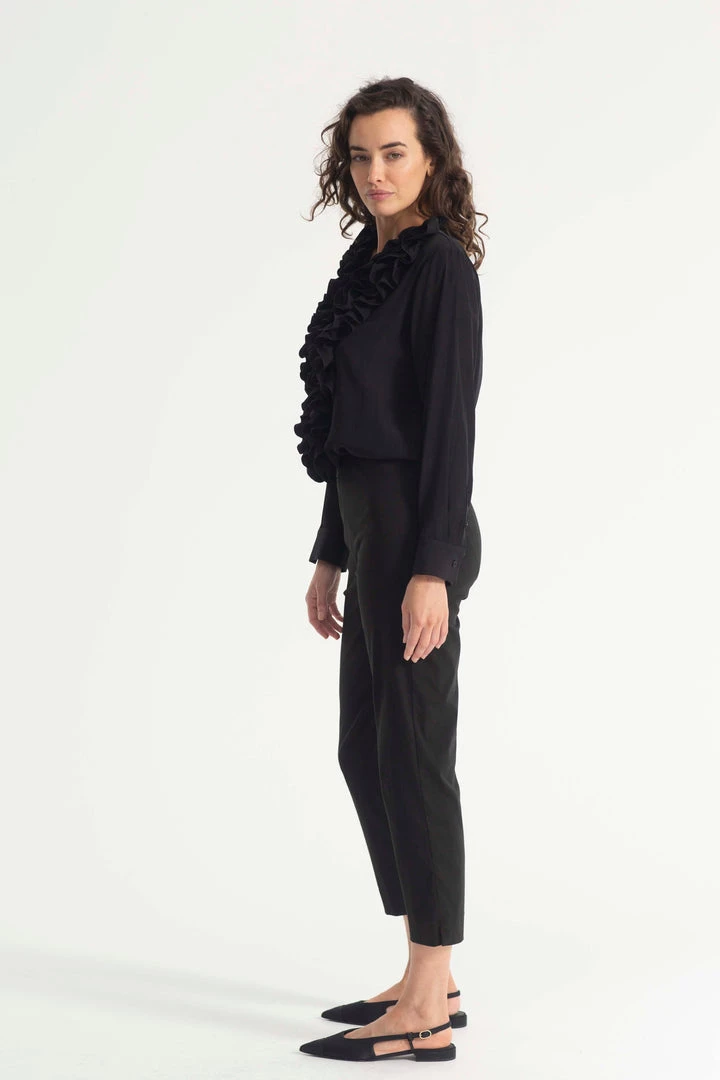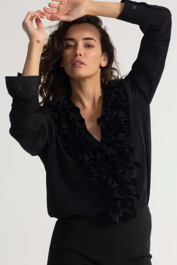 One of our Favourite styles by Mela Purdie ,Made from Mela’s exclusive Mache fabrication, the Rufflet Blouse oozes drama with a dramatic frill front V neckline. Cut for a slightly loose fit that is comfortable and figure flattering, this style features full length sleeves and a slight curved hemline. Wear tucked in with a skirt, or loose over slim pants.