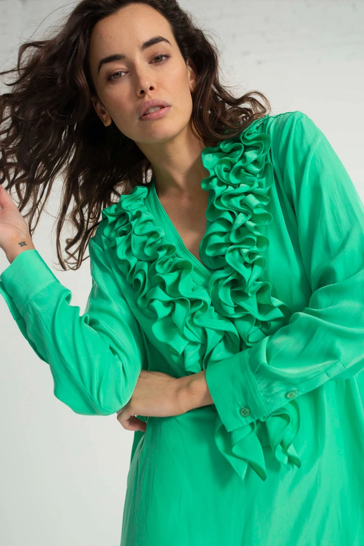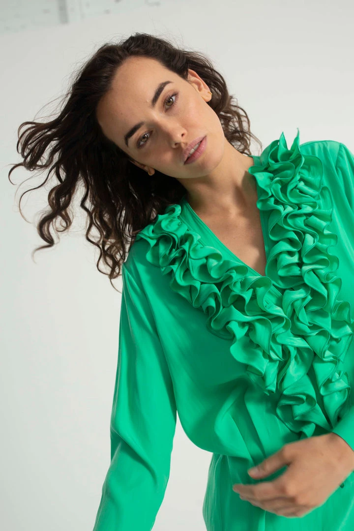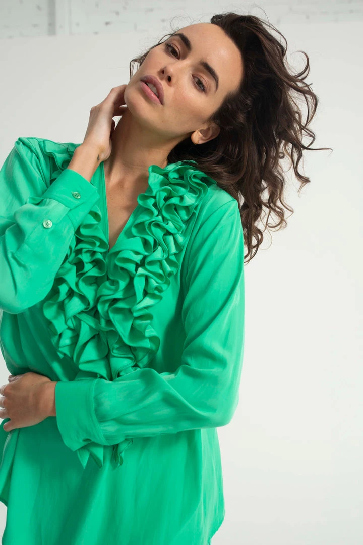 one of our Favourite styles by Mela Purdie ,Made from Mela’s exclusive Mache fabrication, the Rufflet Blouse oozes drama with a dramatic frill front V neckline. Cut for a slightly loose fit that is comfortable and figure flattering, this style features full length sleeves and a slight curved hemline. Wear tucked in with a skirt, or loose over slim pants.