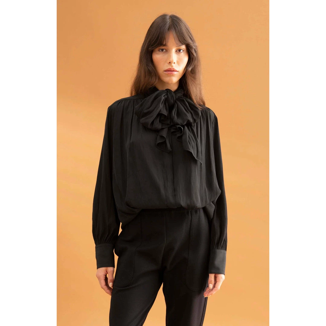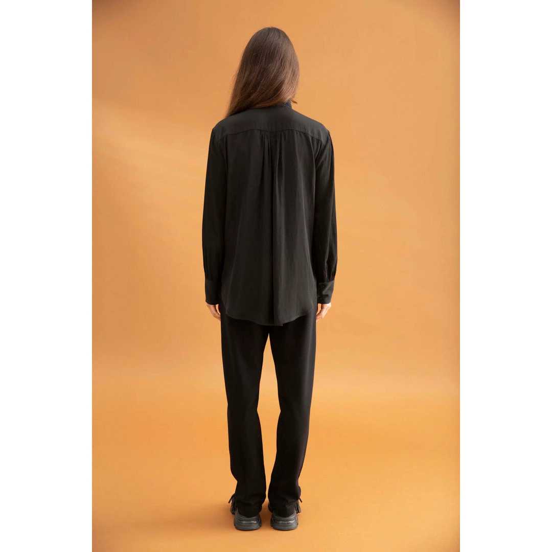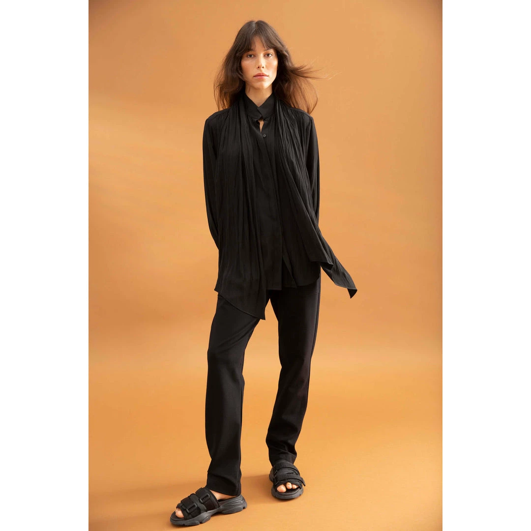 Crafted from Mela Purdie’s fluid Mache, the Scarf Neck Blouse is sophisticated, with a stand collar and concealed button placket. The blouse is finished with a beautiful draping tie at neckline and lightly gathered sleeve with wide nipped-in cuffs to create subtle blouson sleeves.