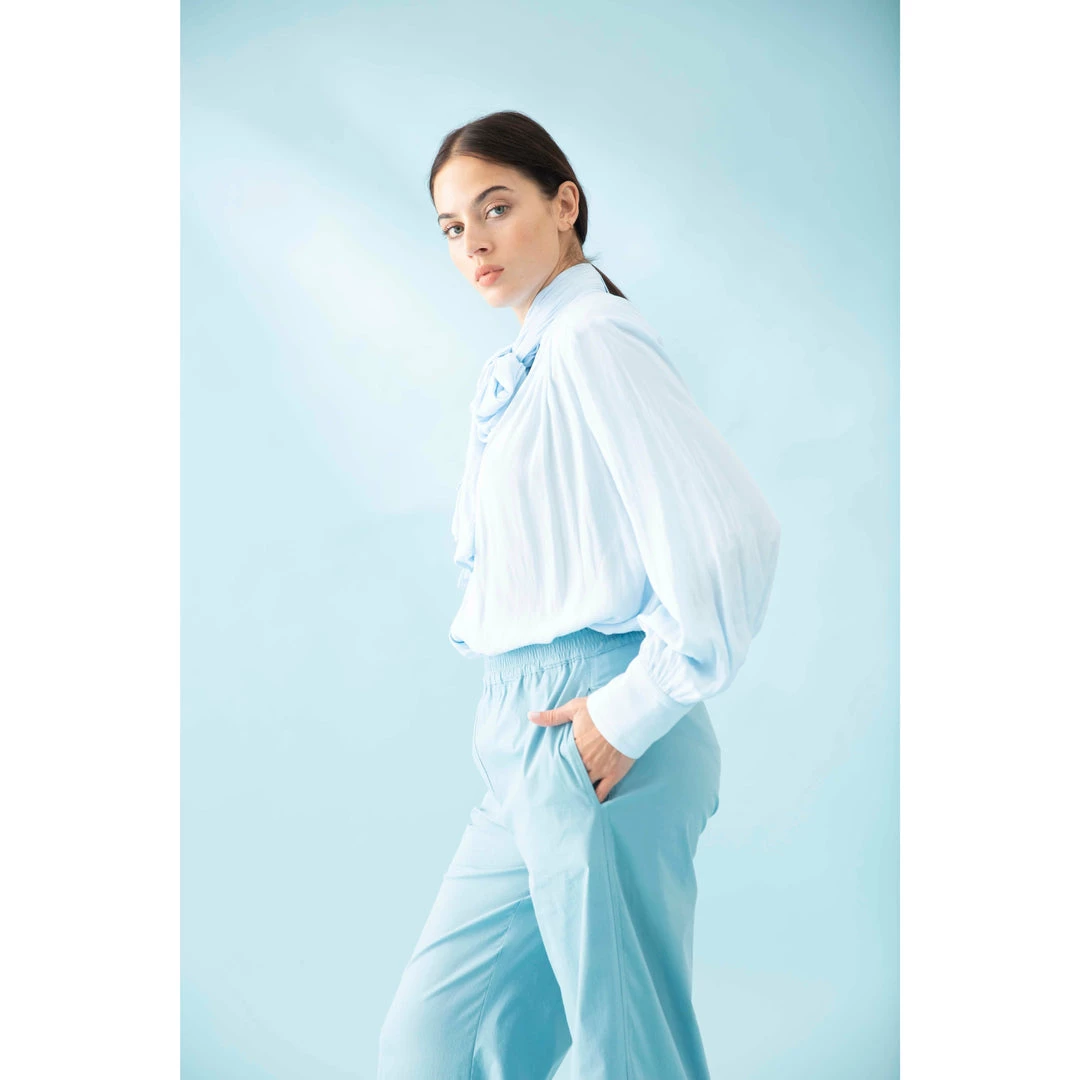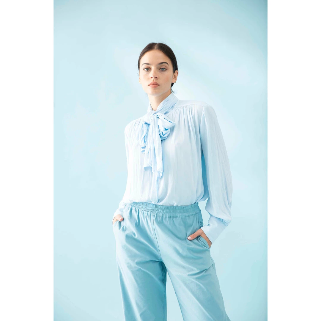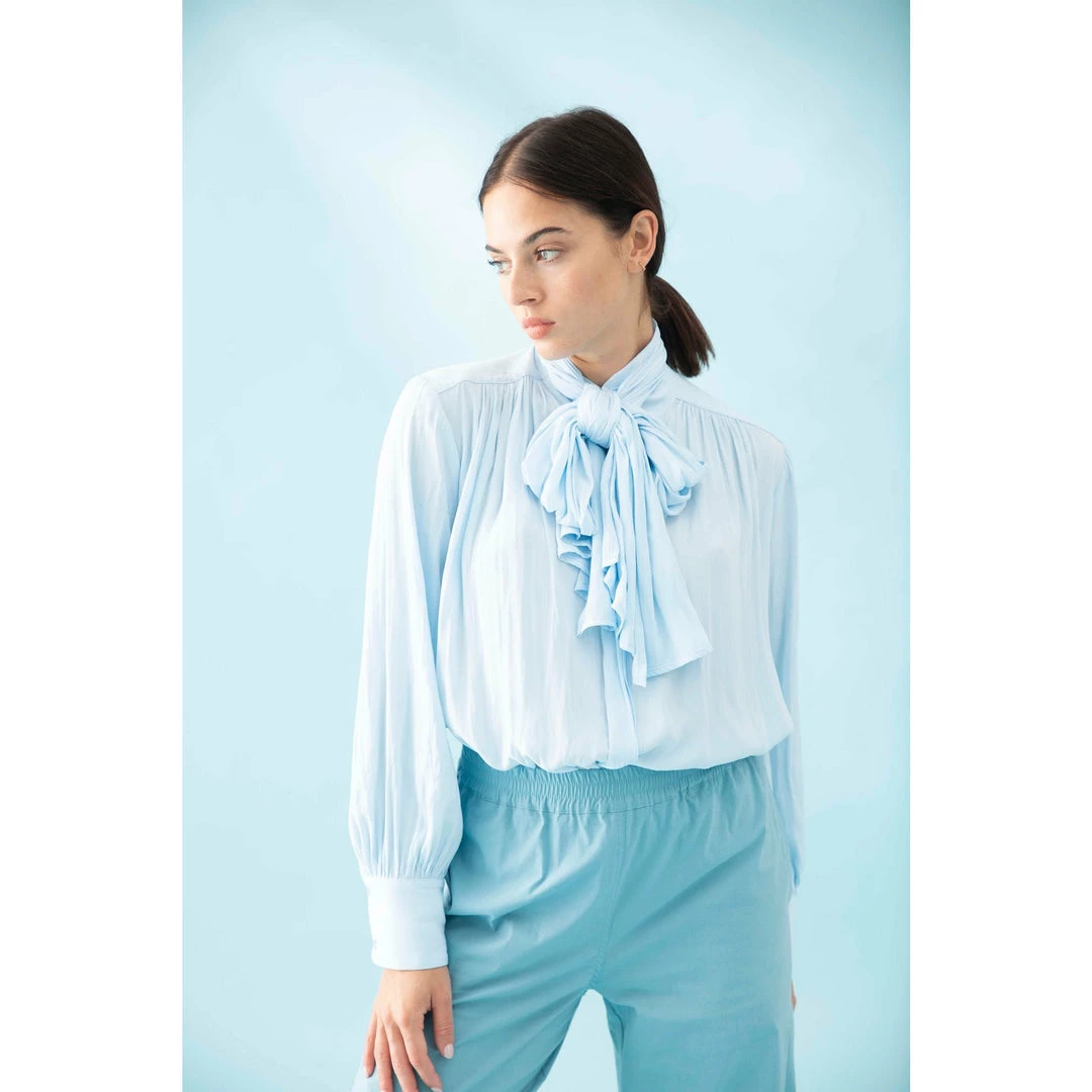 Crafted from Mela Purdie’s fluid Mache, the Scarf Neck Blouse is sophisticated, with a stand collar and concealed button placket. The blouse is finished with a beautiful draping tie at neckline and lightly gathered sleeve with wide nipped-in cuffs to create subtle blouson sleeves.