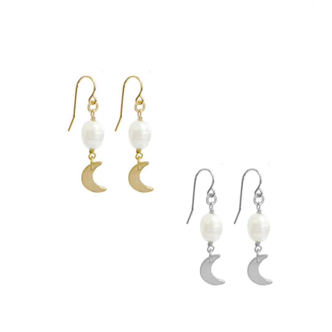 Stunning Fay freshwater pearl and moon charm earring. Available in 14k Gold Filled.