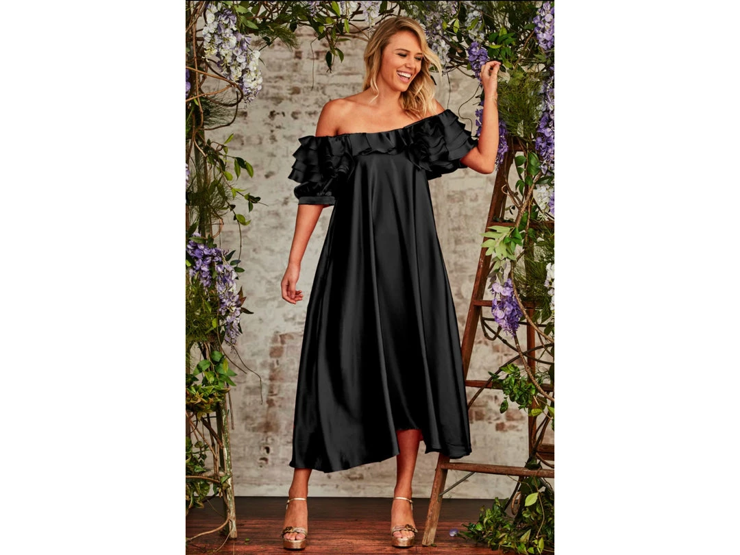 Designed in the ‘Take Drape’ linen blend fabric. Sophisticated, pretty and party-ready. Featuring voluminous tiered frill sleeves that can be worn up or down off the shoulder for a more sultry look. A show-stopping, glamorous yet understated dress for your next special occasion.